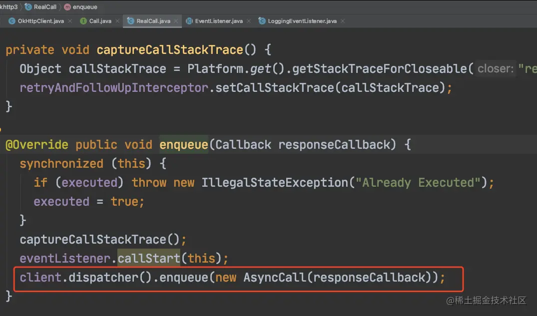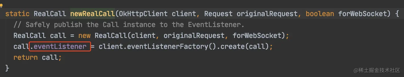 eventListener : 这个东西主要是一个监听器,监听整个okhttp的连接建立以及释放等(tcp和http都可以监听到) 看下 newRealCall的这个参数