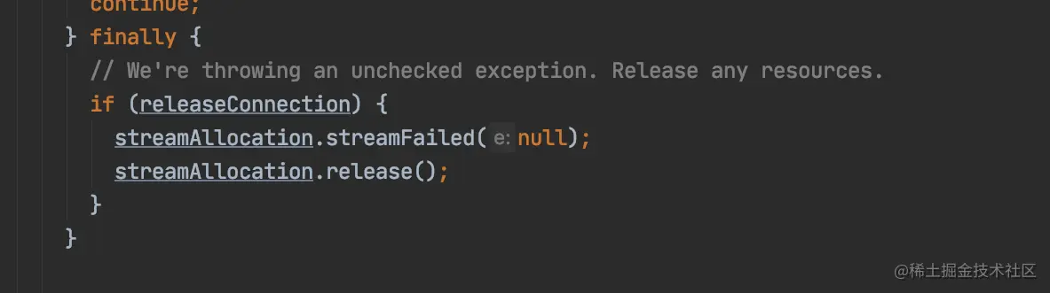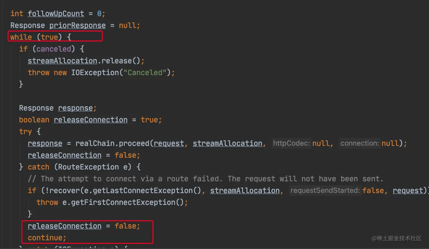 RetryAndFollowUpInterceptor: 顾名思义 这里其实主要是为了请求连接失败 重试用的。