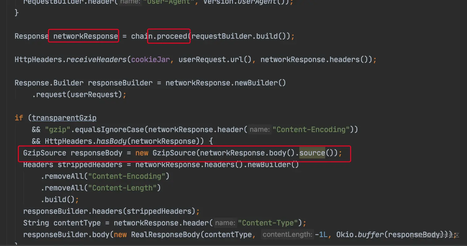 很多人都知道 interceptors和networkInterceptors 区别 但是讲清楚原因的很少 看完前面的分析其实 大概也就知道了 最主要的原因就是 bridge这个拦截器 会对request进行 gzip压缩 对response进行解压缩, network 在他后面 那么 network拿到的就是原始的byte数据了,所以其实大部分场景下 network这个拦截器 对普通开发者来说是没啥用的。 你可以理解为这是一个面向特殊场景 要直接处理 bytes数据的一个勾子