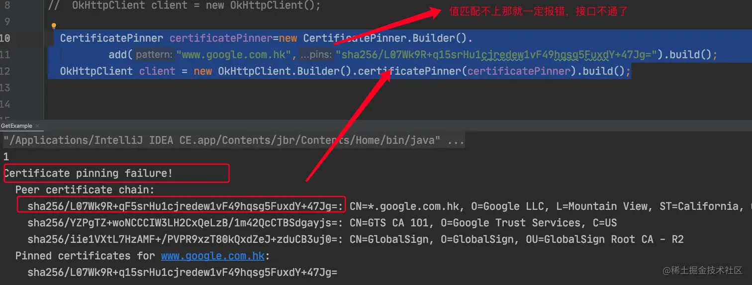 这个就是用来固定证书的,比方说我的项目 我不想申请ca等机构的签名,我不需要去他那边注册,我就搞一个私有的https证书就可以了。 那我们就可以把这个 公钥的值 内置在 在certificatePinner中。 这样也可以通过tls 验证。