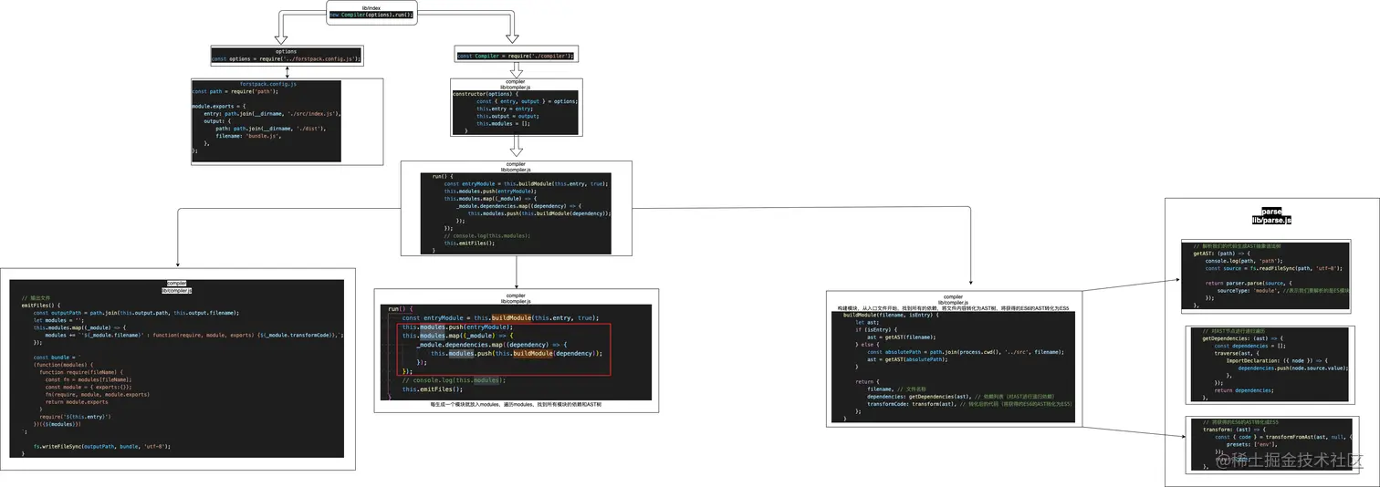 - emitFiles方法。输出文件(同样被run方法调用) 到这里,compiler.js的大致结构已经出来了,但是得到模块的源码后, 需要去解析,替换源码和获取模块的依赖项, 也就对应我们下面需要完善的parser.js。