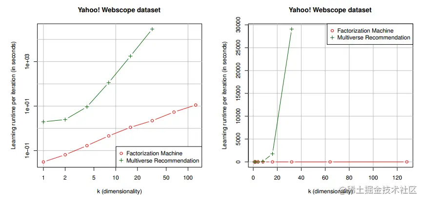 实验结果如下所示,在对于Multiverse Recommendation算法,取m=4,时间复杂度表示如下。FM运行时间为线性,Multiverse Recommendation运行时间为O(k4),差的不是一点。