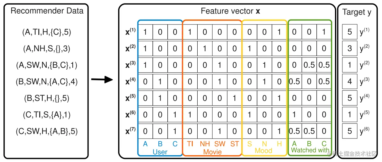 模型输入为用户特征:U={u1,u2,…},商品特征:I={i1,i2,…},以及上述提到的上下文特征C={c1,c2,…}。文中给出例子如下,其中图左侧为推荐输入的特征,中间为编码后特征向量,右侧为预测目标。