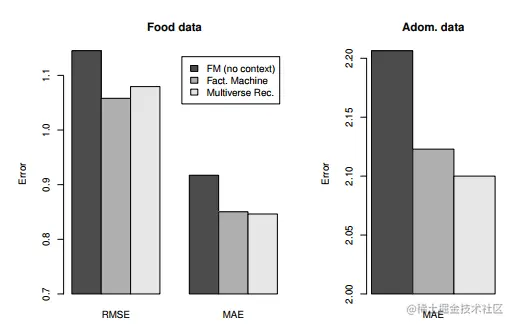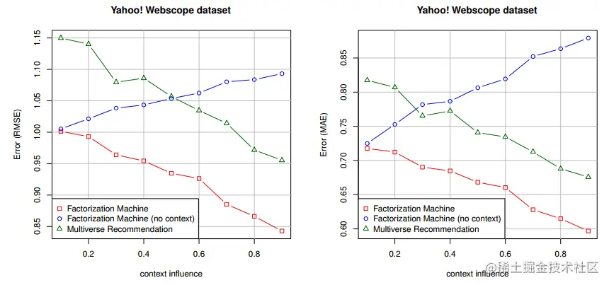 不同方法的在不同数据集上对比结果如下,这里Fact Meachine看着应该就是FM,FM(no context)就退化为简单的线性模型,可以看到FM效果不错,RMSE和MAE都最低。考虑了context的特征下Multiverse Recommendation也比FM(no context)更好。