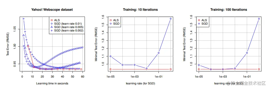 实验结果如下所示,左图表示SGD在不同学习率下误差相差较大,并且ALS是优于SGD的;中间和由图表示在不同学习率下SGD和ALS对比结果,可以看到ALS完胜。
