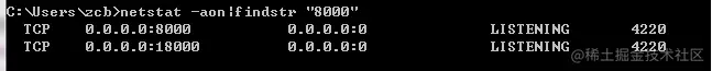 查看被占用端口对应的PID:打开cmd命令,输入netstat -aon|findstr "8000",回车,记下最后一串数字,即PID,如4240