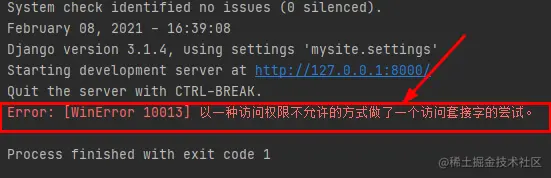 这是因为设置的Django运行端口被其他应用占用了。需要修改运行端口或者关闭占用的应用。