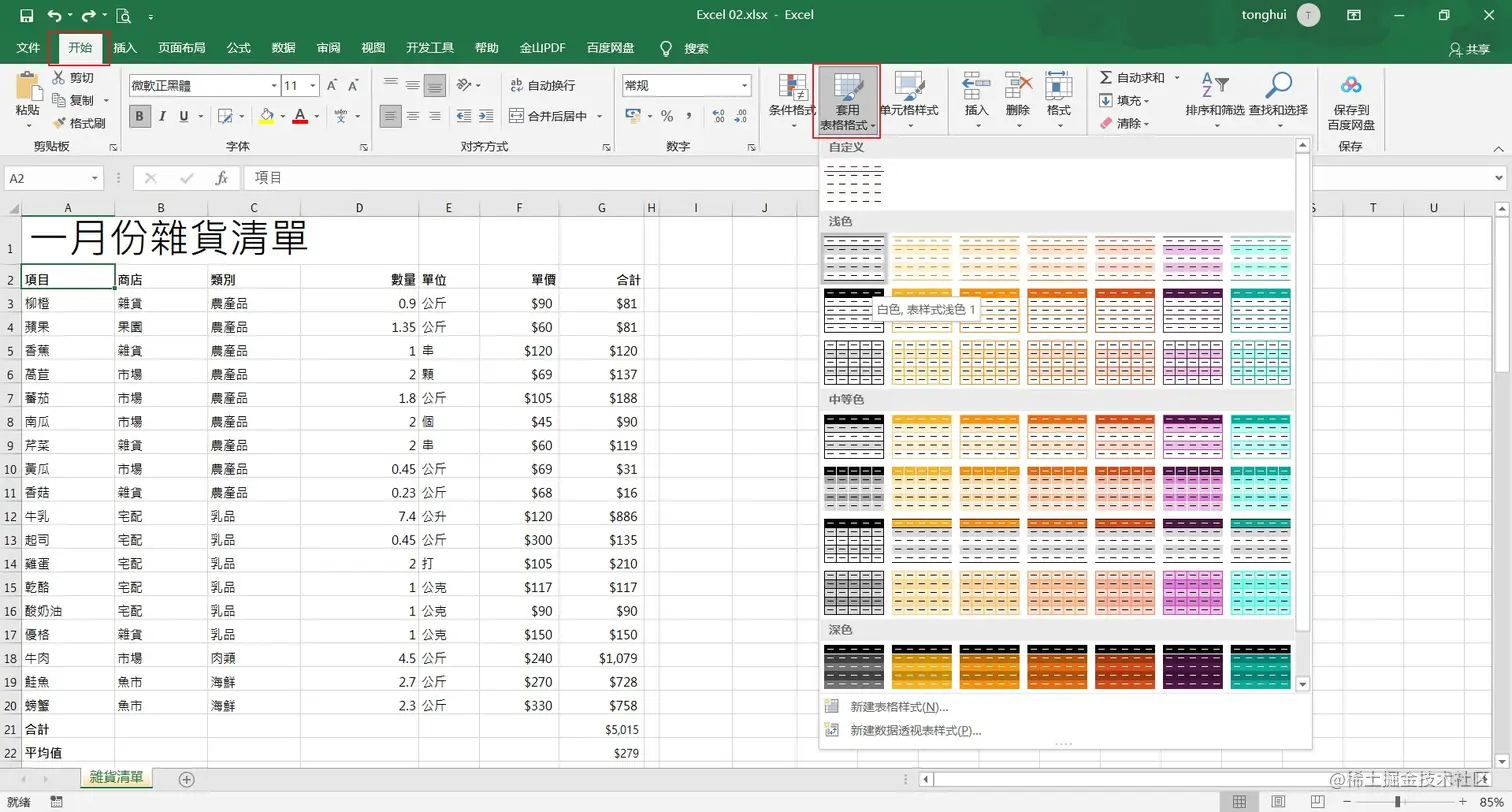 - 注意点一的解决方法三:选取范围后,点击开始面板内的样式,在样式中点击套用表格格式