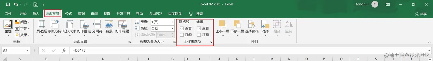 - 注意点一的解决方法一:在页面布局的面板内找到工作表选项,在工作表选项内勾选上网格线或者标题的打印功能