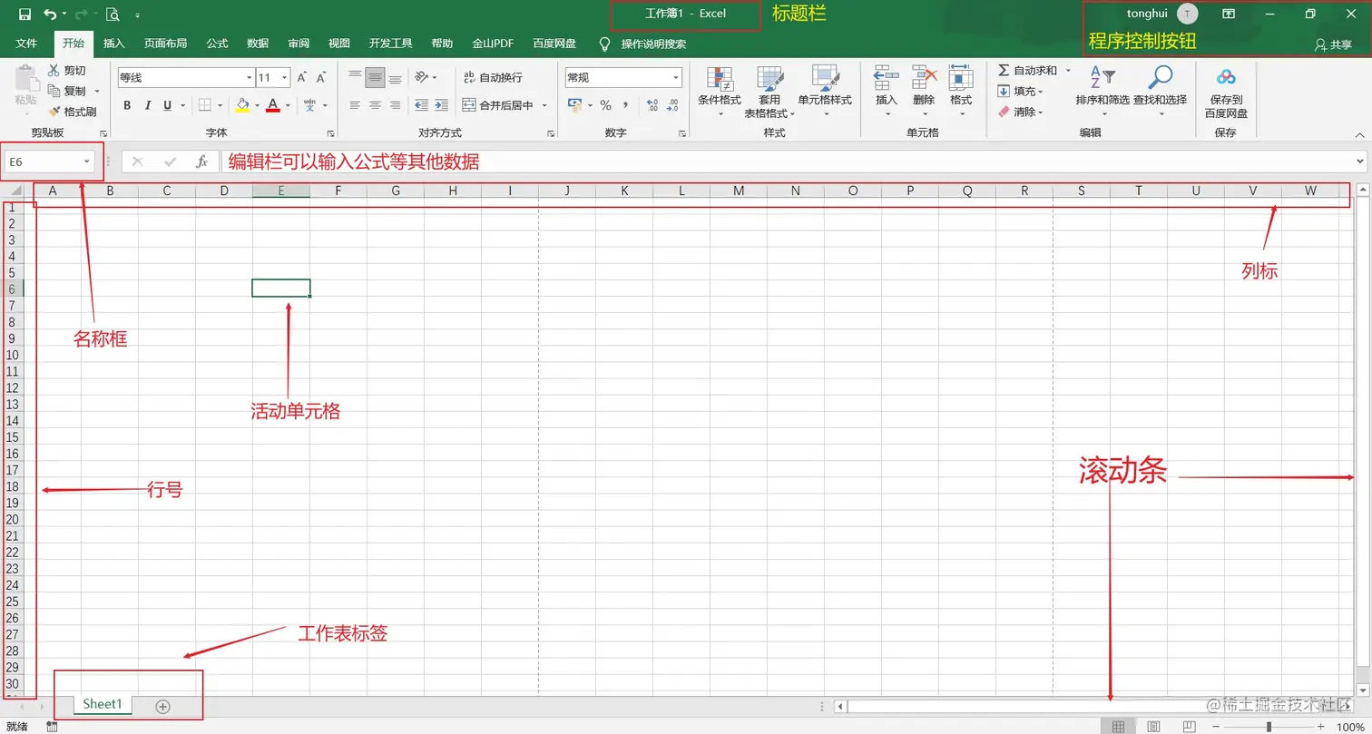 下图是打开EXCEL后的开始页面,我们可以先简单的了解一下界面布局