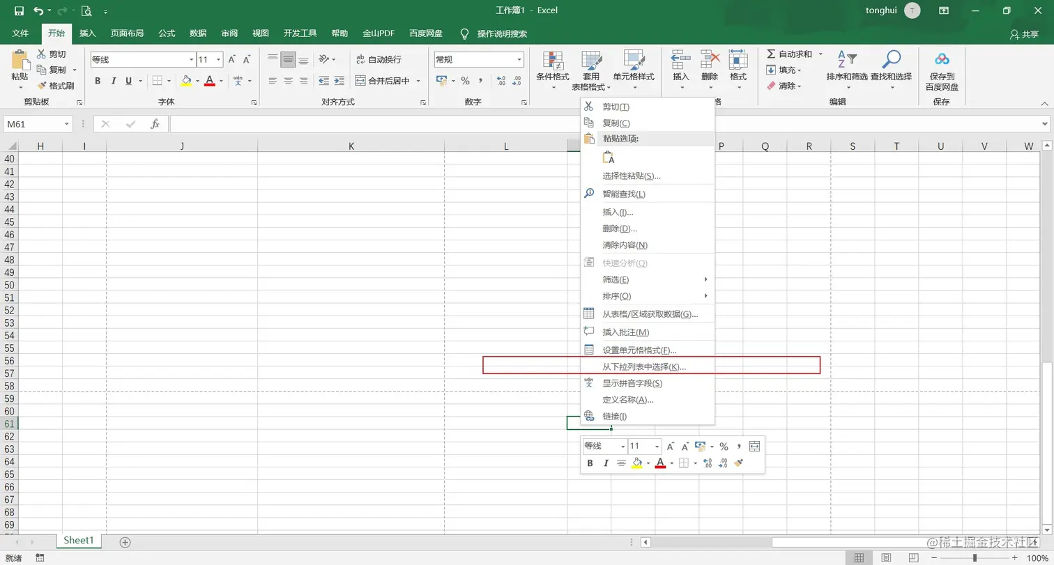 - 在空白的单元格右键调出菜单后,可以看到从下拉列表中选择这个功能,这个功能可以帮助我们快速选择一列中已有的数据,也可以通过快捷键alt键+数字键盘的向下键使用。