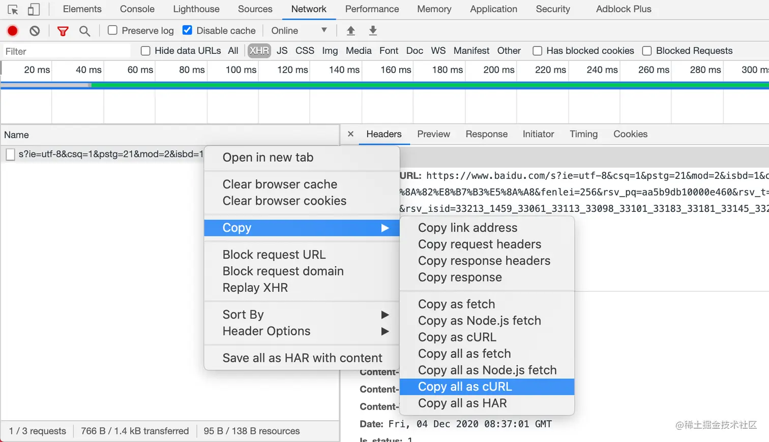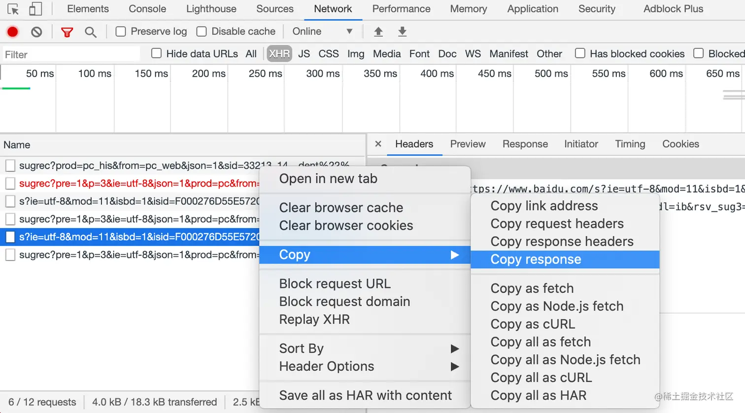 针对XHR请求,一般业务场景下返回的数据包都是json数据,因此还可以右键弹出菜单中选择复制response(常见于渲染侧同学拿到mock数据)