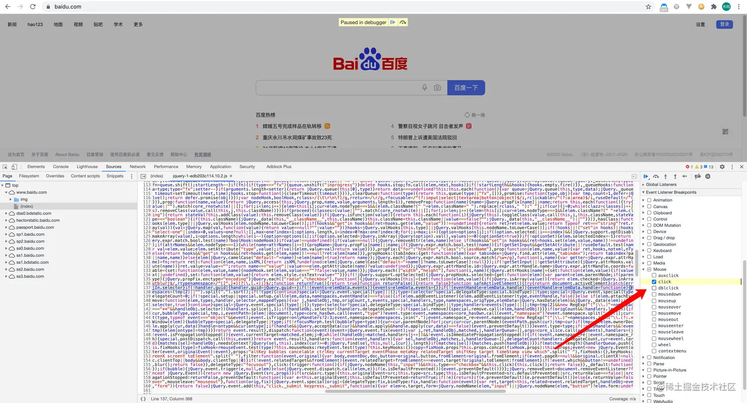 事件监听断点,打开这个列表,在触发该事件时进入断点,调试器会停留在触发事件代码行。