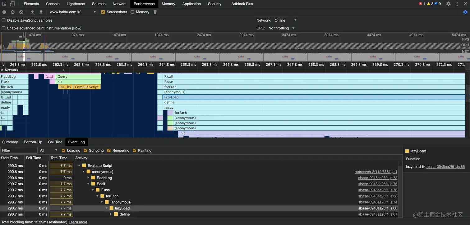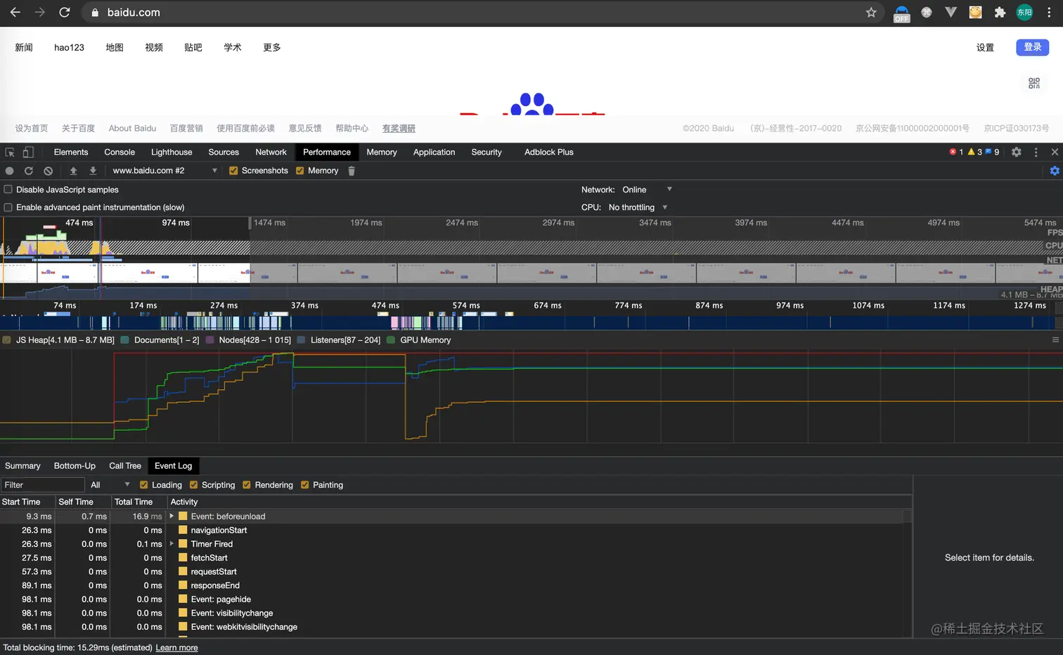 性能监控,在调试某个web网页,想要查看从HTML渲染到屏幕的过程或运行时用户交互时的渲染、重绘、重拍,内存占用、页面变化过程。那么就可以在Performace Tab下,点击红色小圆点即可录制页面的完整变化过程。