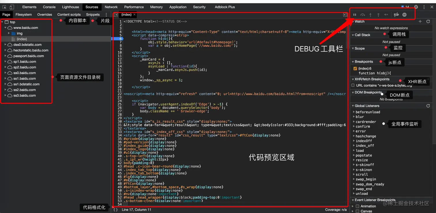 Source面板中可以预览当前网页调用的所有静态资源以及源代码。整个面板的大致功能如下图: