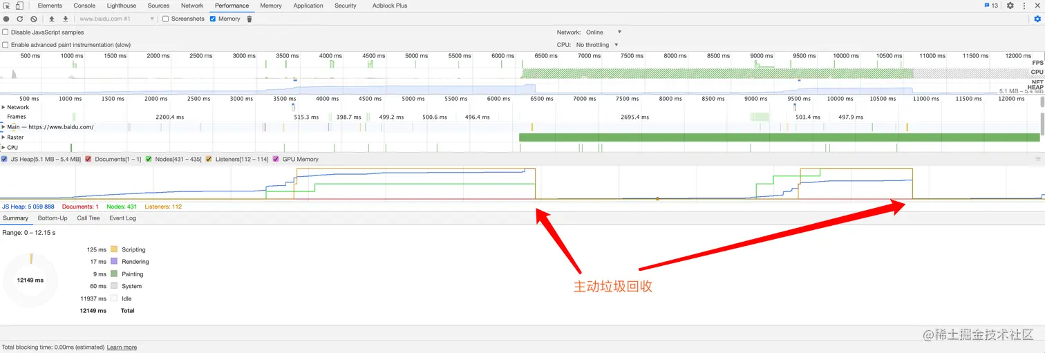 - 内存占用,如果要更专注了解内存情况,可在Memory Tab下录制查看,其右侧的“垃圾桶”按钮是主动垃圾回收