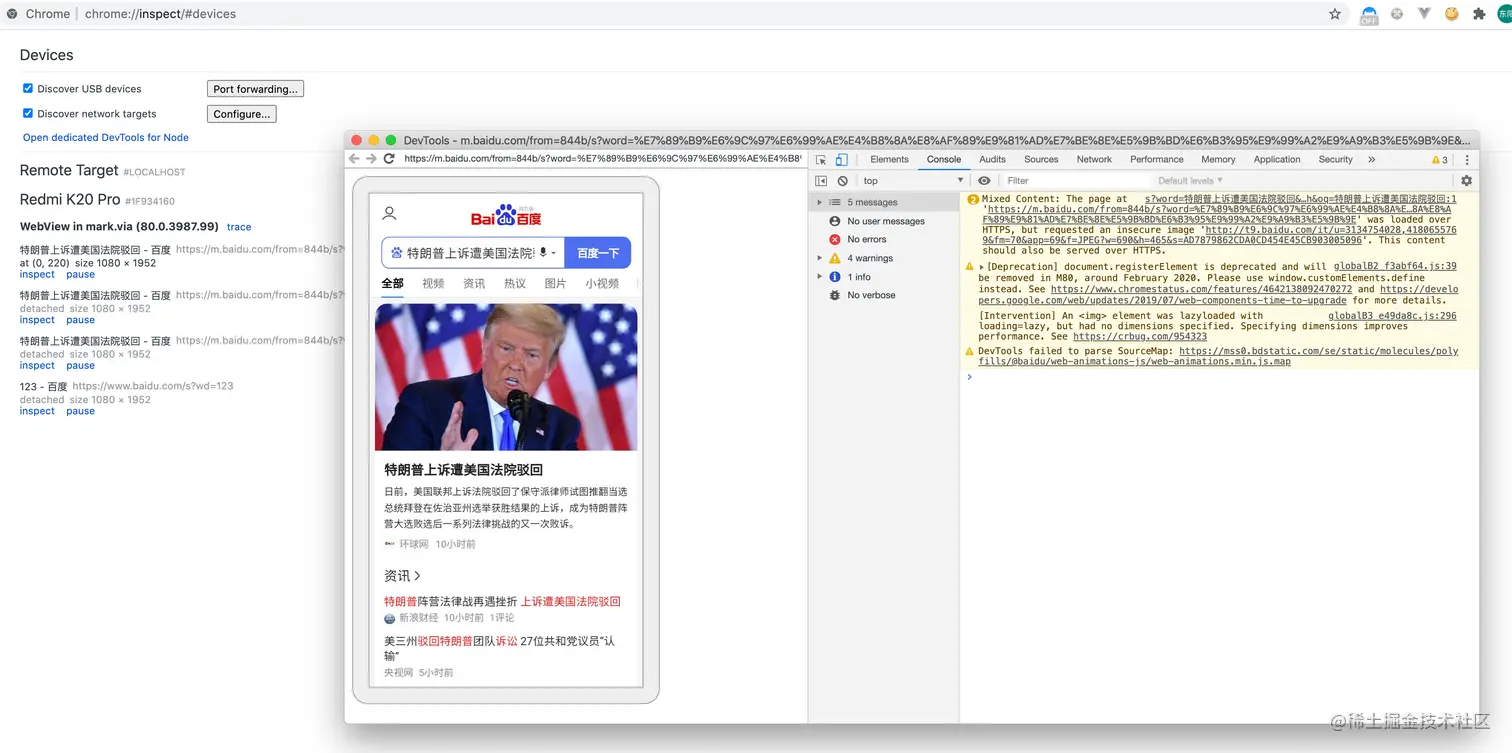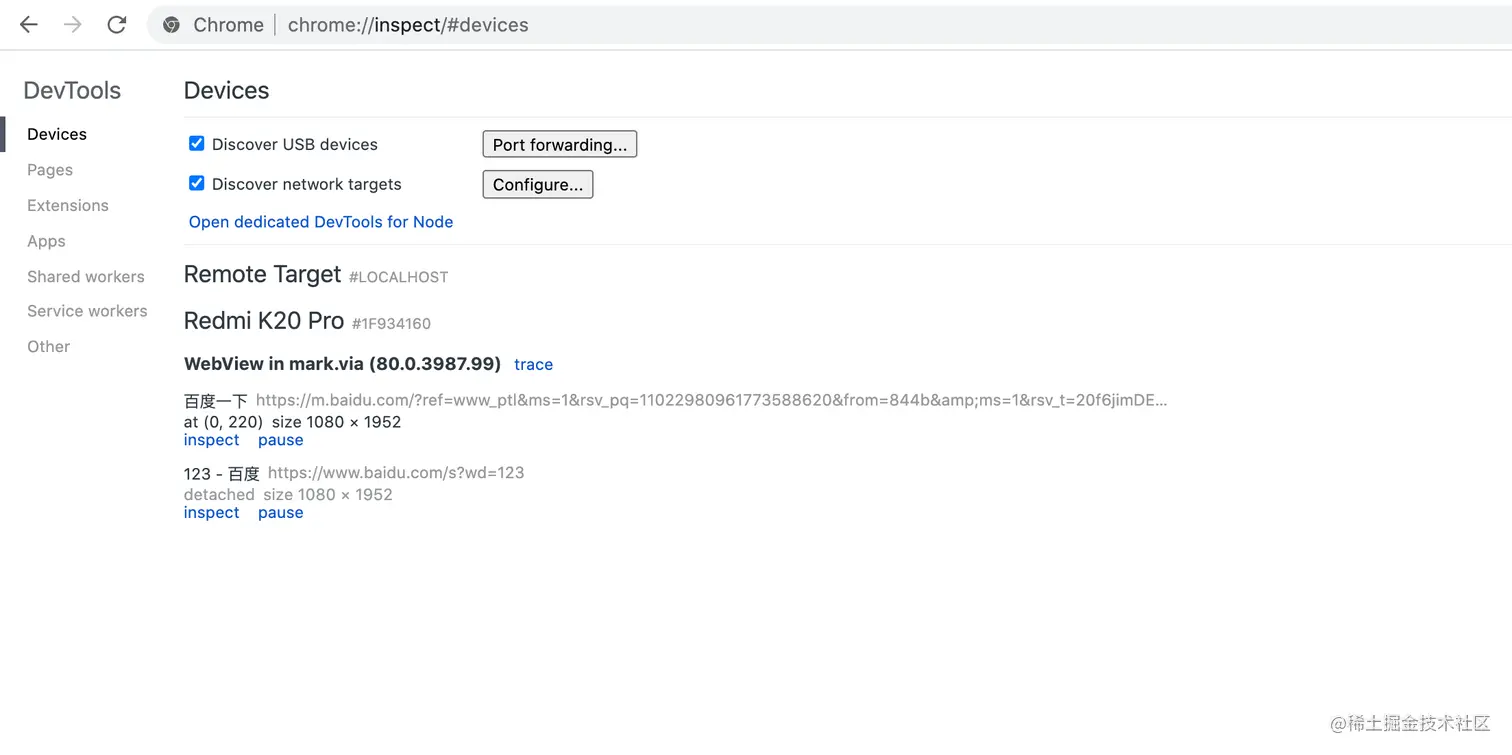 PC与Android设备,Android设备允许调试(开启调试模式,并允许当前设备调试移动端) Chrome浏览器地址栏访问:chrome://inspect,可进入调试网页