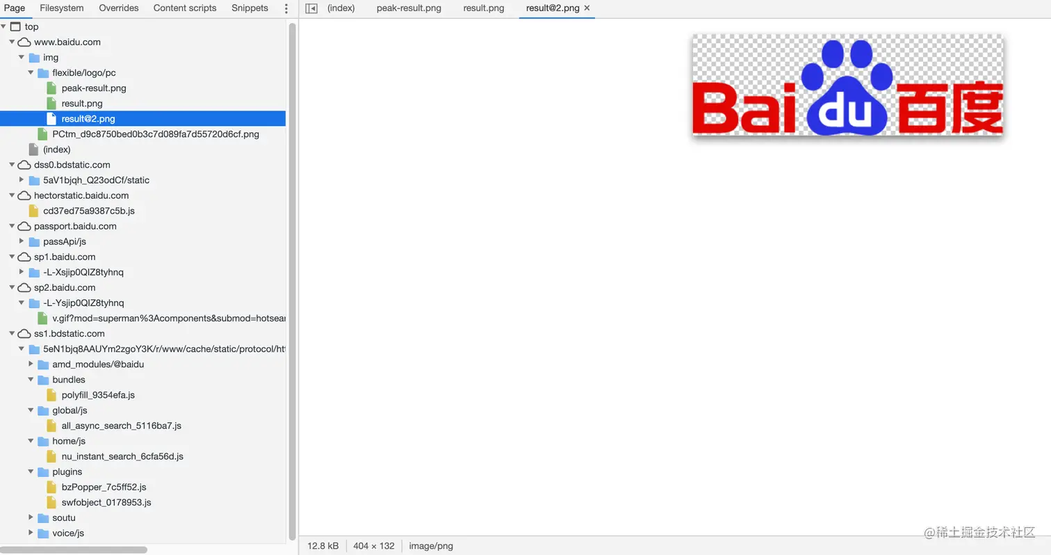 整个Source Tab顾名思义就是源码面板,默认选中“Page栏目”在这里可以看到以域名为列表的静态资源文件目录树,点击文件在主视图中可以预览静态文件