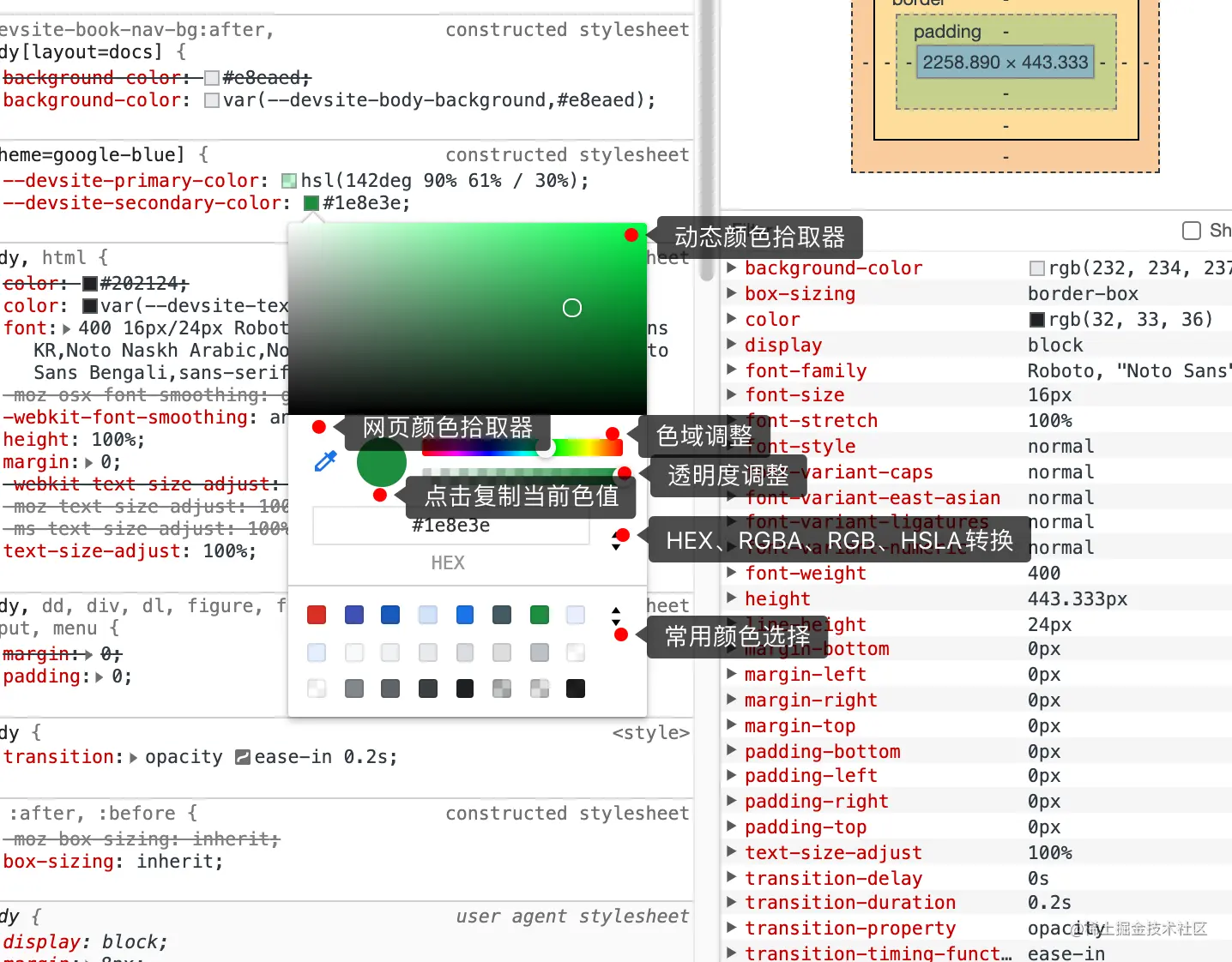 在调试CSS中,设置颜色相关属性的值,颜色有HEX、RGBA、RGB、HSLA的形式,作为一名专业的前端开发工程狮,共 255^3 = 16581375种颜色,反正老夫是记不住。