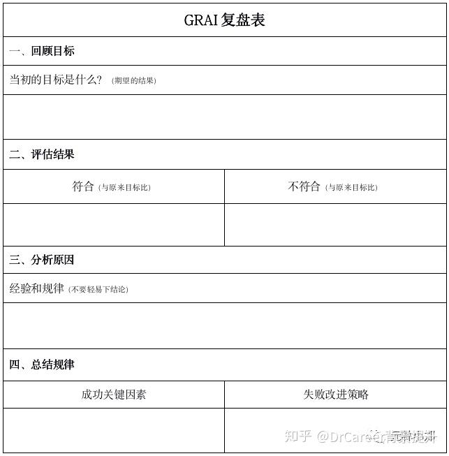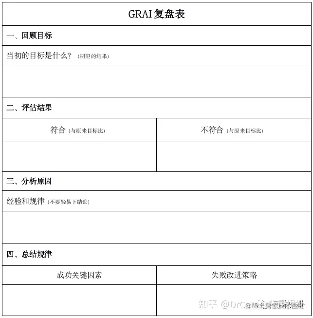 给大家推荐一个复盘方法 - GRAI 工作复盘法,分成四步,分别目标回顾,结果陈述,过程分析和归类总结。