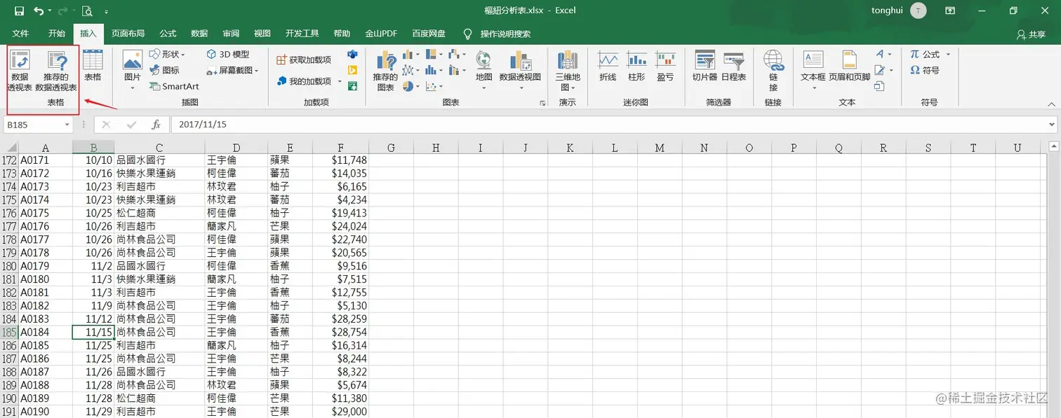 - 方法:点击插入面板中的数据透视表,推荐点击插入面板中的推荐的数据透视表