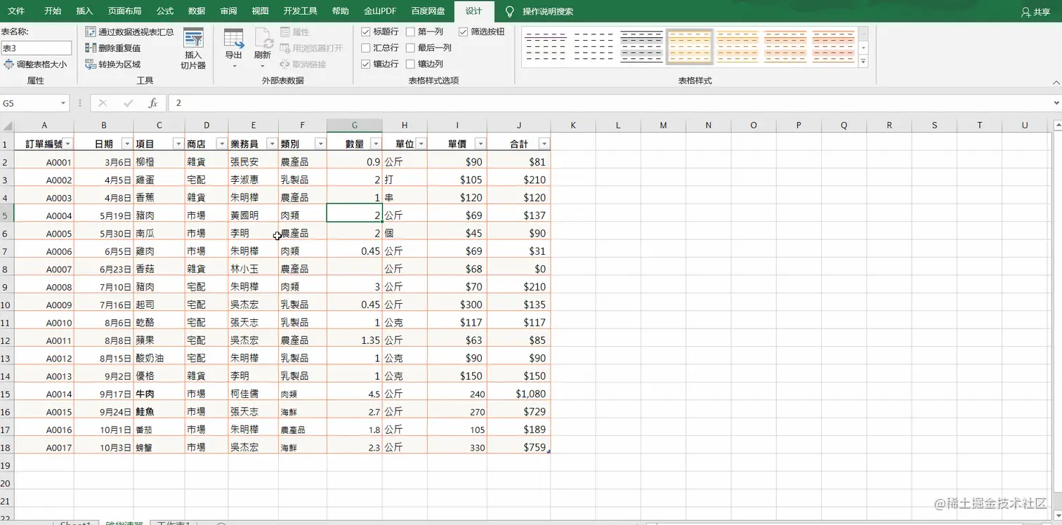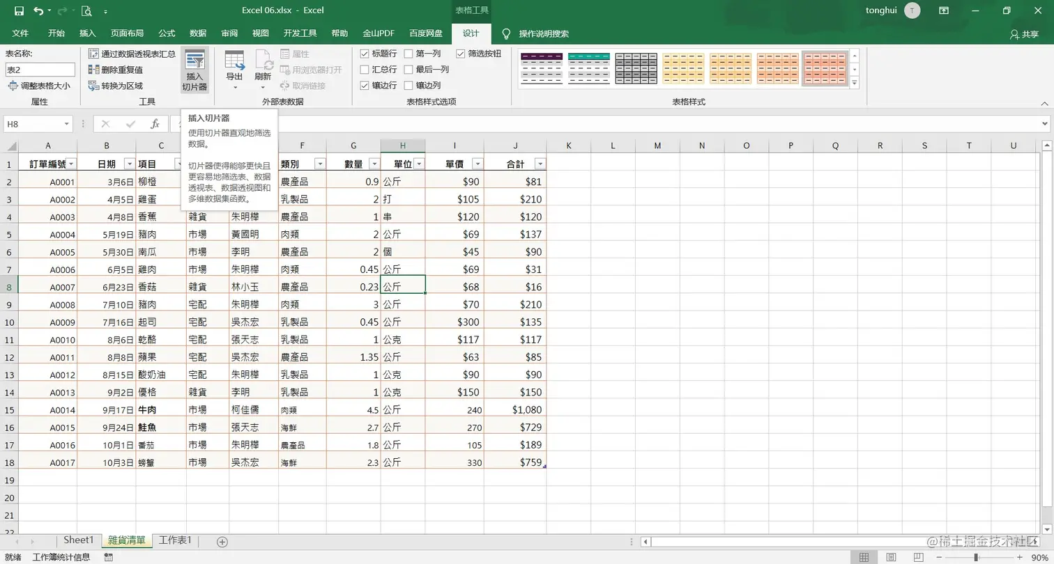 - 方法一:将区域范围转化为表格后,可以点击表格工具面板的设计栏,在设计栏内点击插入切片器,即可根据选项进一步的来分析表格数据