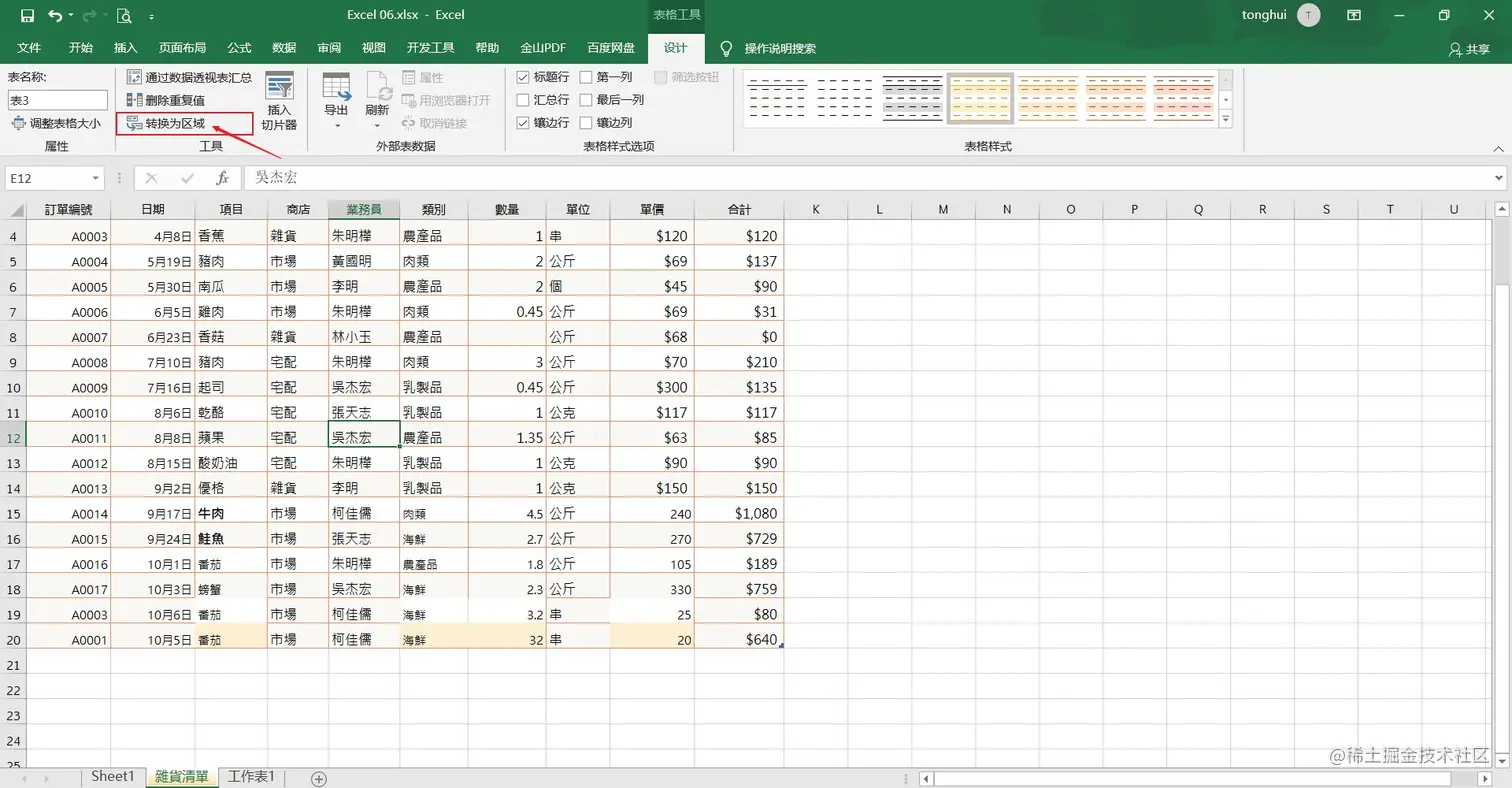 - 方法一:点击表格工具的设计栏中的转换为区域