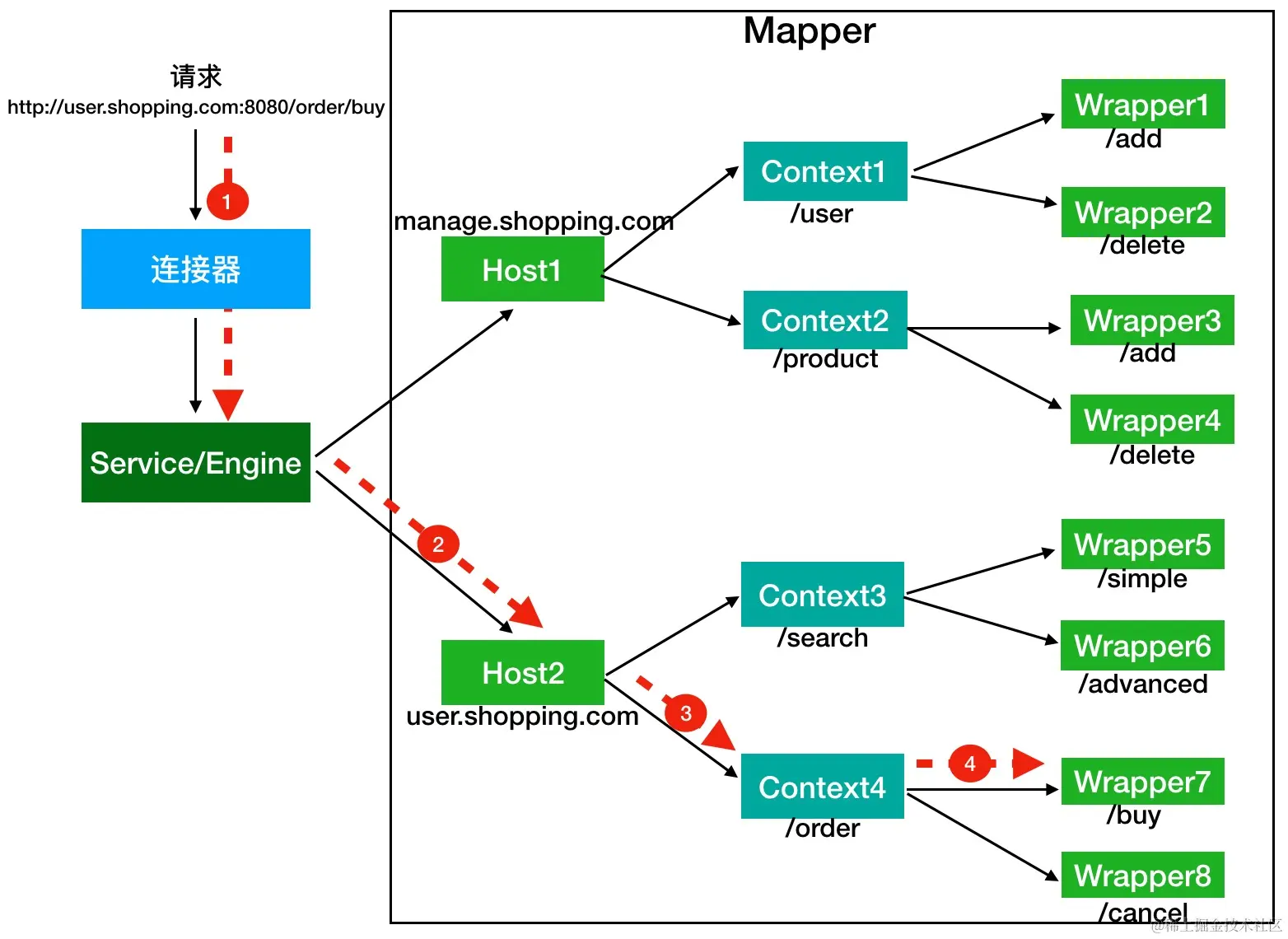 - 最后,根据 URL 路径找到 Wrapper(Servlet)。