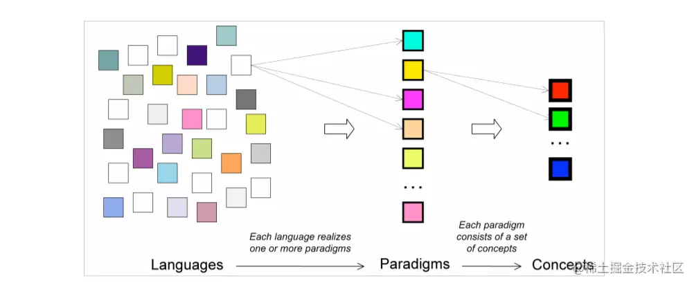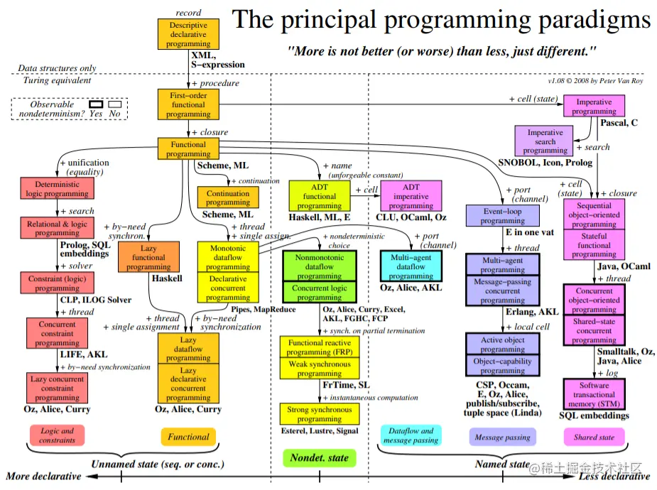 该图中每个盒子是一种范式,箭头指的是从一种范式到另一种范式添加的concepts,可以看到两个看起来完全不同的范式可能只差一个concept(比如functional programming and object-oriented programming)。