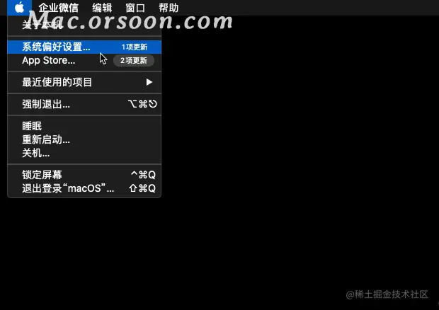 1.单击苹果图标打开菜单,打开系统偏好设置。