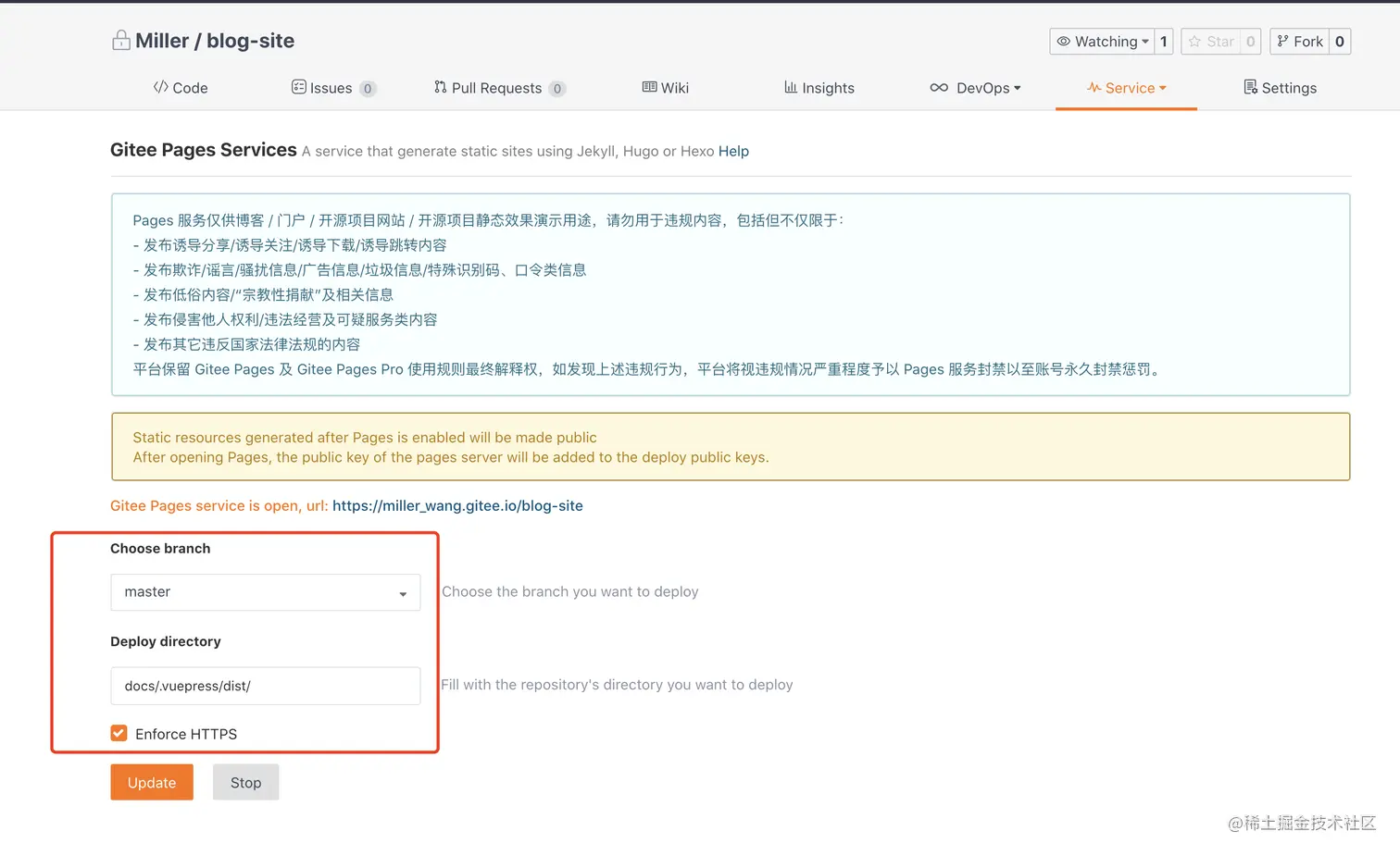 Service)->Gitee Pages - 配置你的部署路径 默认