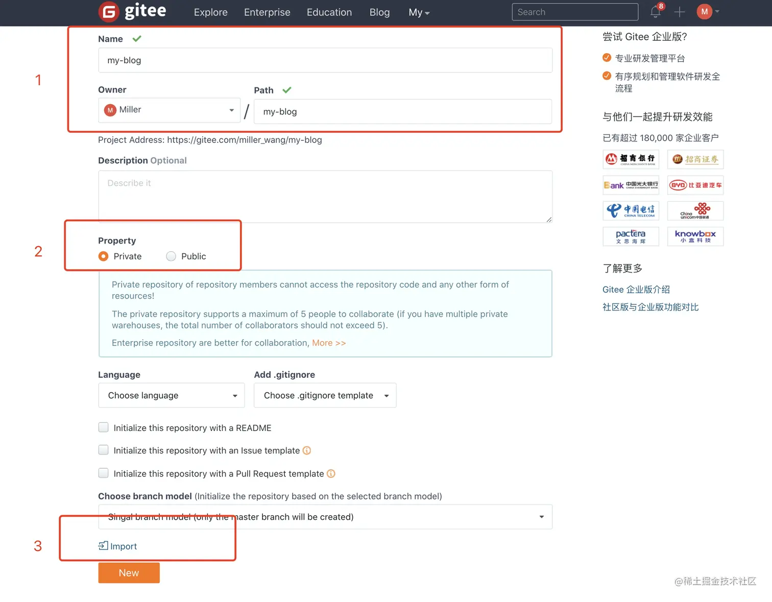 一、登录 gitee,新建一个仓库