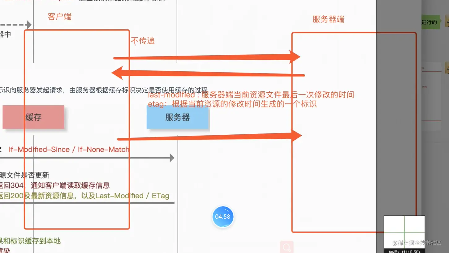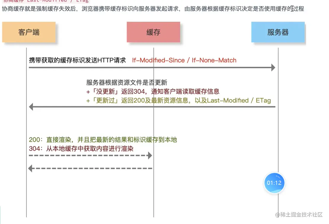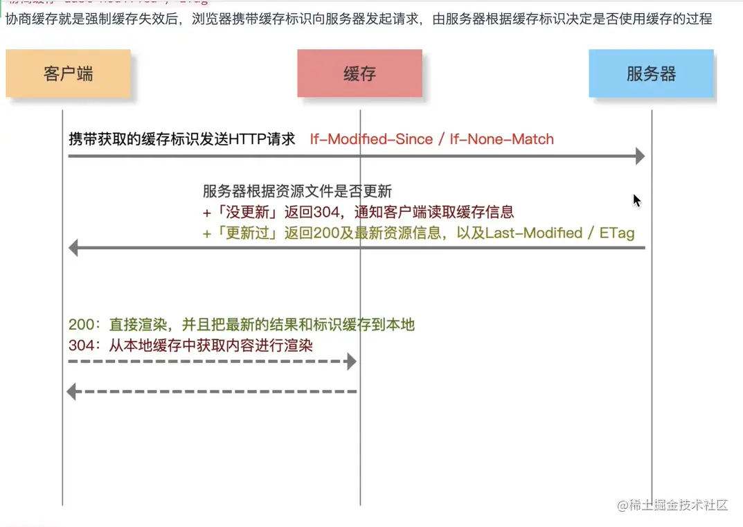 协商缓存就是强缓存失效后,浏览器携带缓存标识向服务器发起请求,由服务器根据缓存决定是否使用缓存的过程