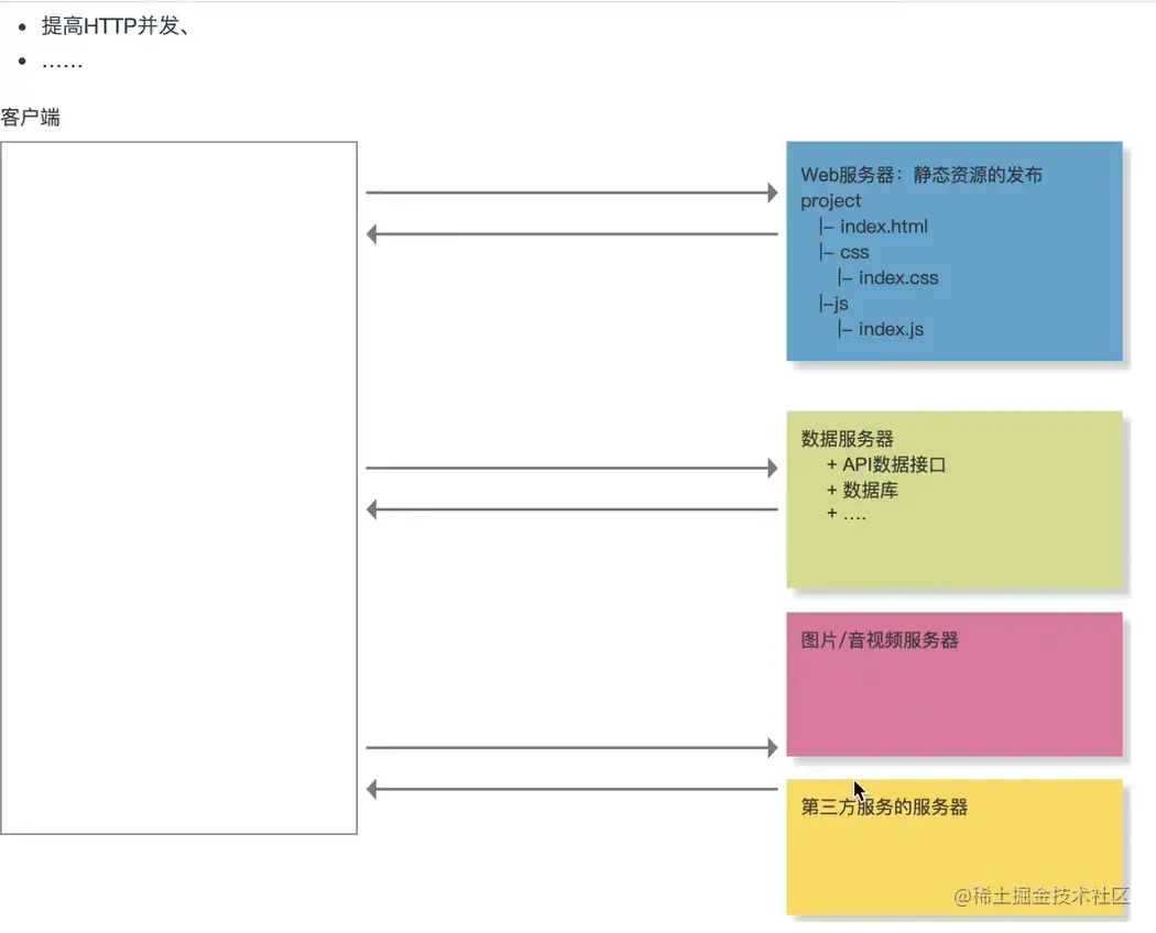 3.减少DNS请求次数,一个项目中,仅可能只访问相同的服务器,不要访问过多的服务器和域名(但是项目中为了做更好优化,往往服务器会很多,做服务器集训)