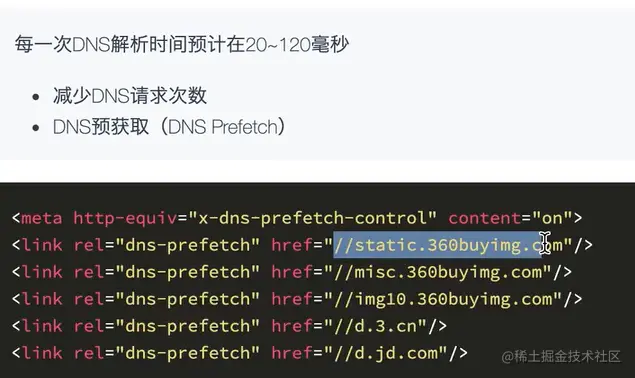 第一次DNS解析时间预计在20-120毫秒 ,减少DNS请求次数,用DNS预获取(DNS Prefetch)