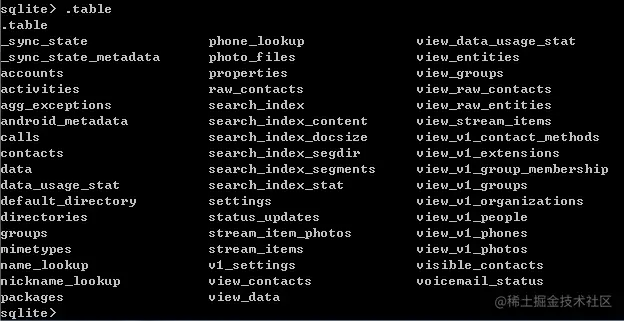 其中后缀名为 journal 的文件是日志文件,我们不用管,contacts2.db 和 profile.db 才是真正的数据库文件,可以使用 sqlite3 命令来打开数据库,如下图所示: