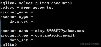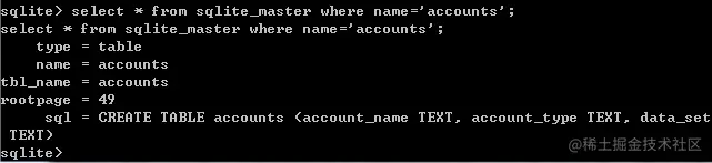 OK,CREATE TABLE accounts (account_name TEXT, account_type TEXT, data_set TEXT) 这就是 accounts 表的建表语句了,通过这种方式我们可以查询到任意一张表的建表语句,从而对我们学习和分析数据库表结构有所帮助。