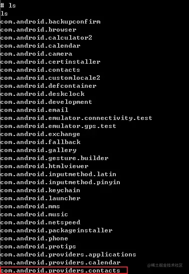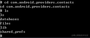 OK,确实有很多,毕竟手机上所有的应用程序都在这里。其中,com.android.providers.contacts 中存放的就是联系人的相关数据,我们进入到这个目录再 ls 一下: