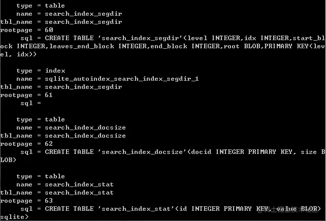 除了查询命令之外,还有其它的增删改命令都和标准的 SQL 语法是相同的,即 insert、delete 和 update,由于比较简单,我就不再赘述了。比较值得一提的是,每个 SQLite 数据库中都还有一个隐藏的 sqlite_master 表,这里记载了当前数据库中所有表的建表语句,可以使用 select * from sqlite_master 命令进行查看: