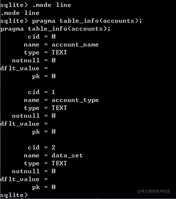 可以看到,一共显示了三条结果,表示 accounts 表中共有三列。但是,所有的字段都缩在了一行里面,并用 “|” 符号分隔,这样我们很难看出每个字段的含义。很简单,只需要换一种显示模式就行了,比如说 line 模式就挺不错的。输入. mode line 命令切换显示模式,然后重新运行 pragma 命令,结果如下图所示: