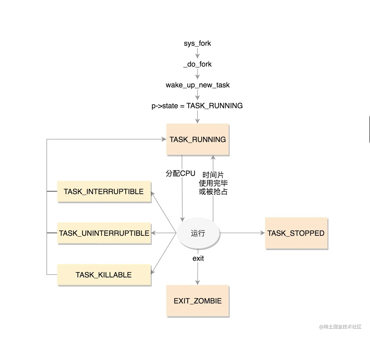 于是,我们就有了一种新的进程睡眠状态,TASK_KILLABLE,可以终止的新睡眠状态。进程处于这种状态中,它的运行原理类似 TASK_UNINTERRUPTIBLE,只不过可以响应致命信号。
