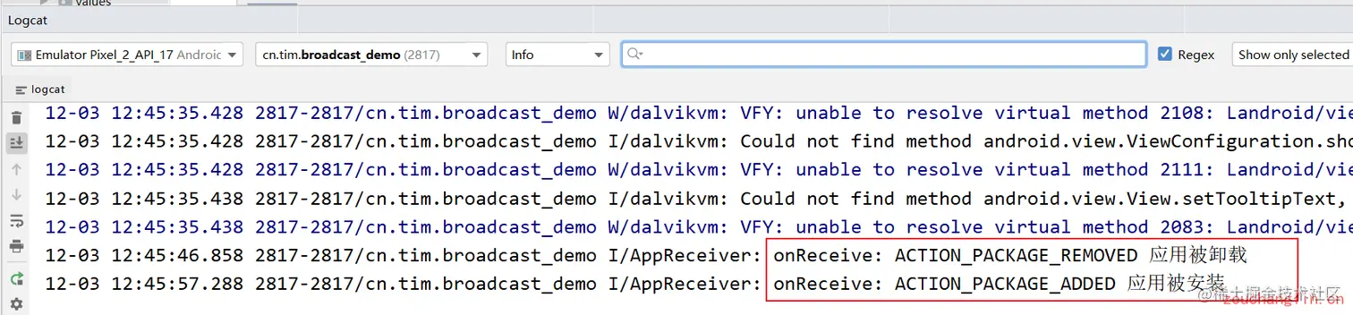 在进行应用卸载和安装的时候,就可以收到对应的广播了: