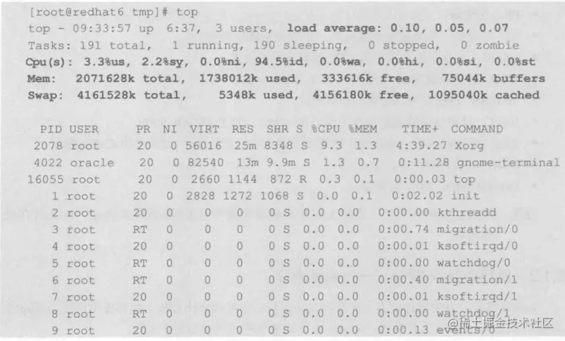 显示系统整体资源使用情况——top命令,top的前半部分是系统统计信息,后半部分是进程信息。