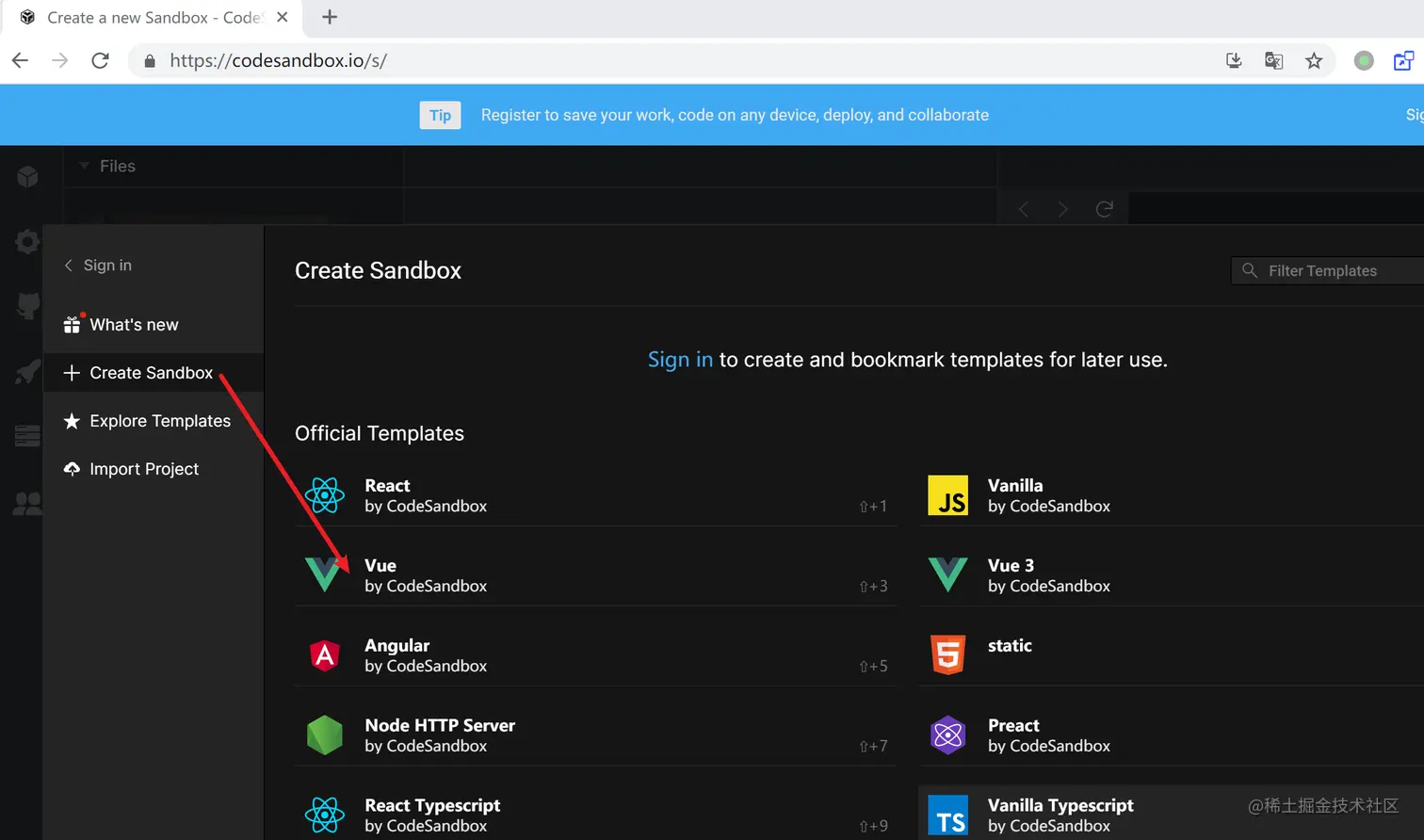 - 搜索codesandbox,进入官网后创建沙盒(无需登录)。