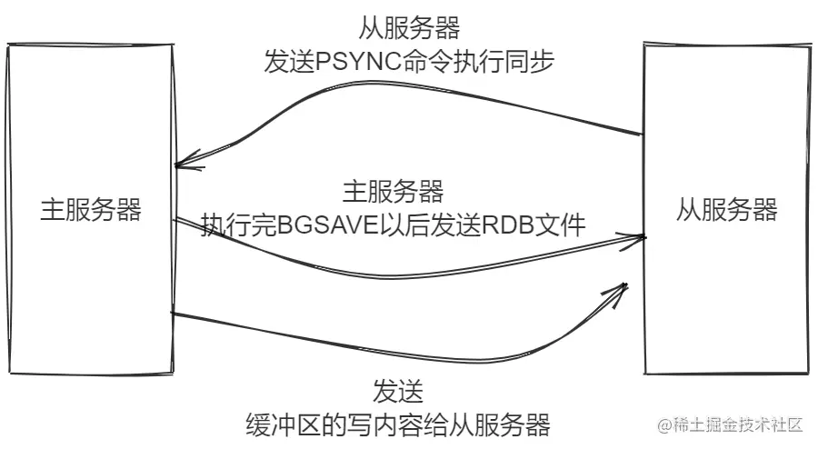BGSAVE操作(不懂这个命令的可以参考juejin.cn/post/692684…),在后台生成一个RDB文件,并使用一个缓冲区来记录开始执行BGSAVE之后的所以写命令. - 当主服务器完成