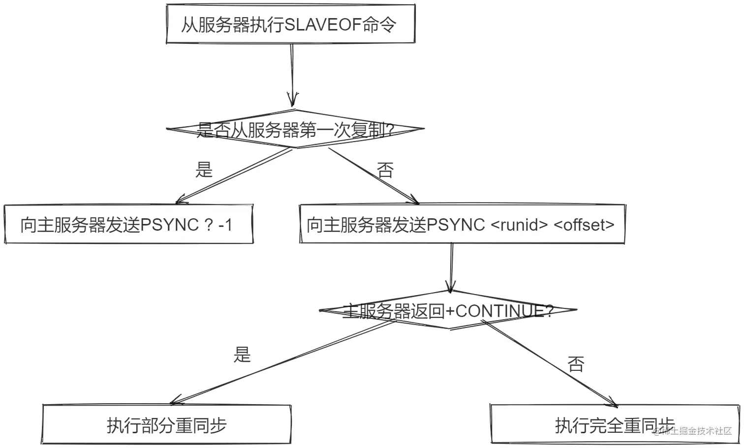 - 如果不同,说明本次的主服务器和之前的主服务器不是同一个,那么执行完全重同步.