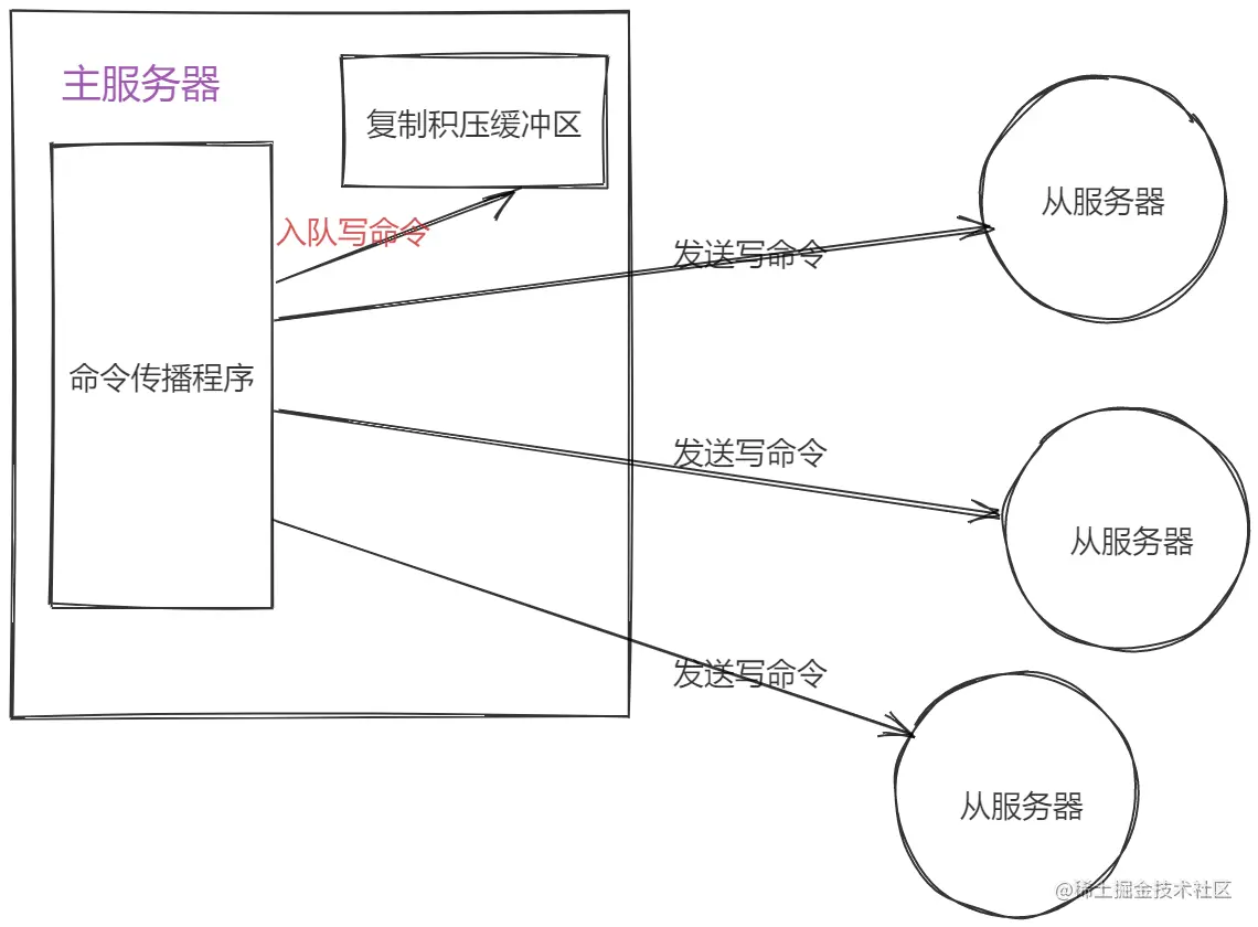 当主服务器进行命令传播的时候,它不仅会将自己执行的写命令发送给所有从服务器,而且会将写命令入队到复制积压缓冲区.如图: