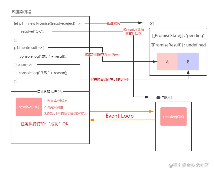then方法也是同步操作,但是then的callback函数是异步的,then方法执行可以理解为将then中的callback函数存储在p1实例中,在Promise中resolve函数执行之后会通知存储在p1实例中对应的方法执行