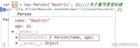 var p1 = new Person('Beatrix', 21);//先于重写原型创建