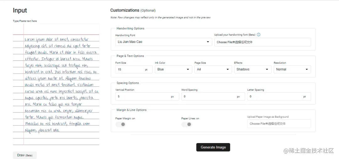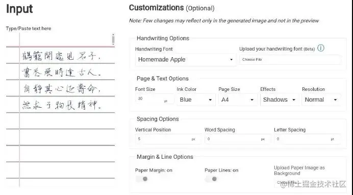 作者提供了一个在线地址供我们使用,地址是:saurabhdaware.github.io/text-to-han… Input 输入需要转化的文字,右边选择手写字体,字体大小,图片尺寸,单词、字母间隙等,然后点击 Generate Image 按钮,即可生成手写体图片。